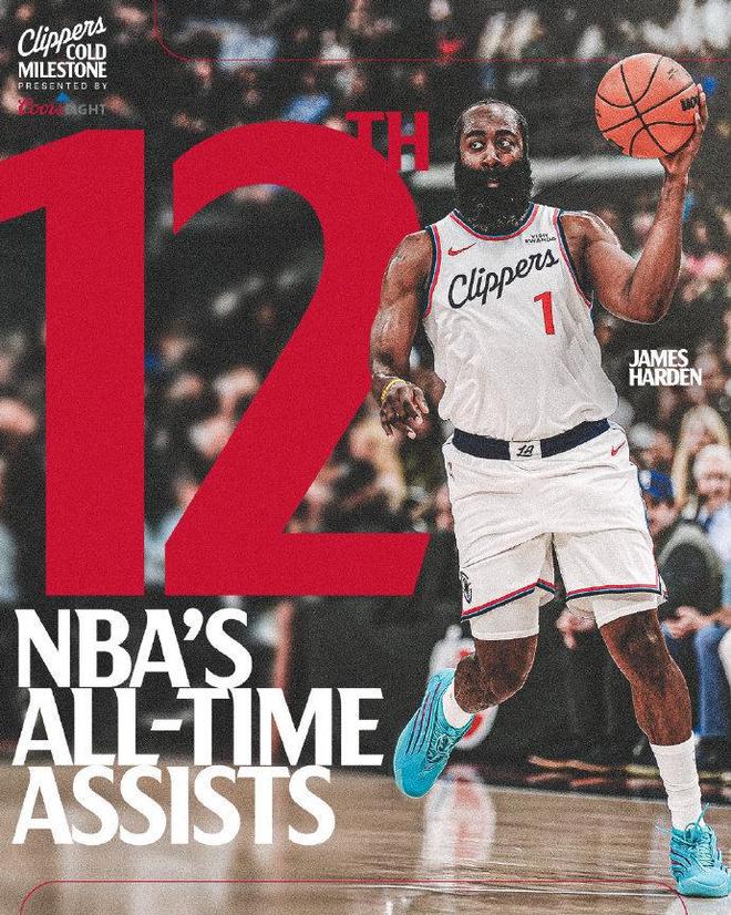 哈登生涯助攻数超越安德烈-米勒,正式升至NBA历史助攻榜第12位。
