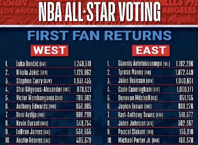 2026年NBA全明星球迷投票首轮结果出炉,东契奇领跑全联盟(票王),字母哥东部第一。而作为联盟老牌球星的代表,库里拿到100多万票,排在西部第三;杜兰特则以差不多55万票排在西部第八,詹姆斯则以差不多54万票仅排在西部第九。东道主的哈登则只有21.5万票排在西部第12位,莱昂纳德只排在第20。