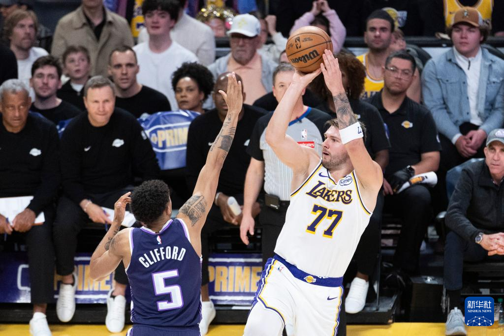 12月28日,湖人队球员卢卡·东契奇(右)在比赛中投篮。