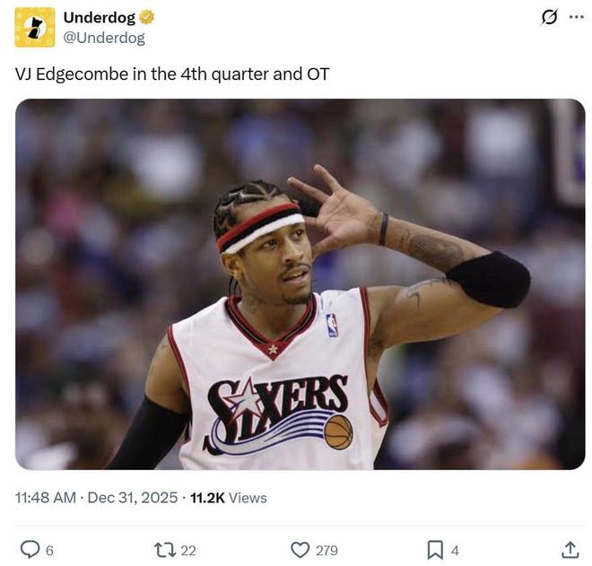 面对埃奇库姆这样的表现,美媒Underdog晒出艾弗森配图,直言:“埃奇库姆末节与加时像极了那个男人。”