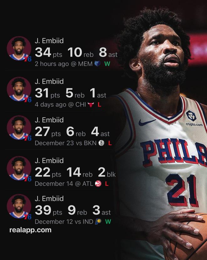 过去5场比赛,恩比德场均拿下30.6分8.8板3.4助1.4断0.6帽,但命中率只有47.6%,本场比赛更是恩比德本赛季首次连续两场交出30+得分表现。