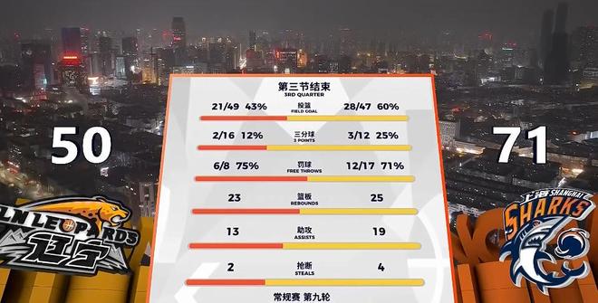 三节上海只扔进了3记三分,罚球17-8辽宁。
