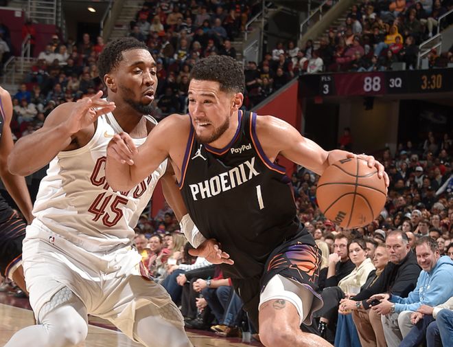 太阳客场挑战骑士,太阳少了杰伦格林、阿伦,骑士少了亨特、斯特鲁斯,骑士优势明显,一度领先24分,最终以16分优势拿下比赛。米切尔18中10(三分7中4)得到34分10板7助2断,莫布利10中7得到16分10板5助5帽,太阳方面布克25中13得到32分2板4助,狄龙15中7得到20分3板3助3断。