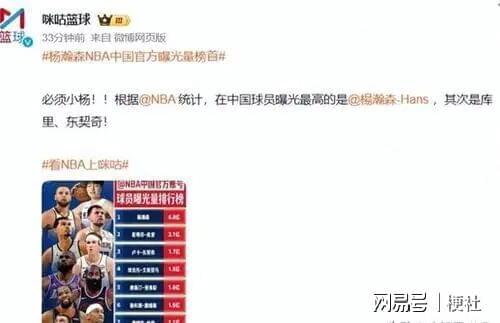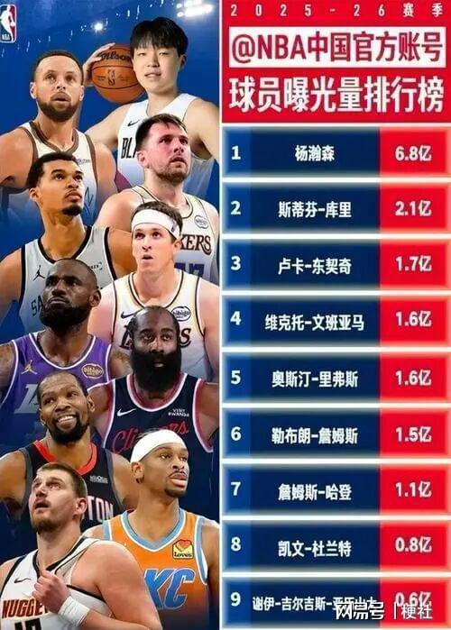 NBA中国发布的榜单中,第一名是拥有中国国籍的杨瀚森。他的曝光量不仅断层领先,还远远超过了库里的曝光量。