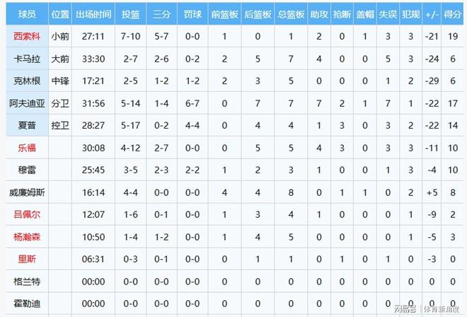 咱瀚森,今天他没被按在板凳上(DNP),可上场时间还是少得可怜,零零散散的。第三节还剩3分11秒的时候,他脱掉“外套”(上场),和罗威组成双塔组合。嘿,这小子还挺争气,命中了他职业生涯的第3记三分。末节垃圾时间,他又上场了,可惜队友太不给力,又菜又爱玩,他只能跟着来回折返跑,连续5 - 6个回合连球都摸不到,最后只能靠自己拼命抢后场篮板和前场篮板,才好不容易拿到球。整场比赛下来,小杨一共打了10分49秒,4投1中,三分2中1,拿到3分5板(其中1个是前场篮板)。其实他得分本可以更多的,有一回他使出华丽脚步,,然后抛投,结果球在篮筐上颠了几下,还是掉了出来,这运气,真是背到家了。不过呢,他也有个让人暖心的收获,他NBA职业生涯三分球一共21投3中,成功超越了前辈姚明(姚明生涯三分球10投2中),这算里程碑,也算是给小杨一点安慰啦。