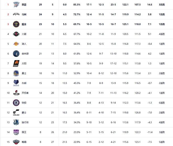 2-6名:马刺(24胜9负)、掘金(23胜10负)、火箭(21胜10负)、湖人(20胜11负)、森林狼(21胜13负)