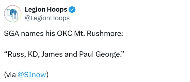 北京时间1月4日,在接受《体育画报》节目采访时,亚历山大被问及俄克拉荷马城雷霆队史“总统山”(即队史最伟大的四位球员)人选,他的回答简洁且意味深长,几乎没有丝毫犹豫:“威斯布鲁克、杜兰特、哈登,还有保罗-乔治。”