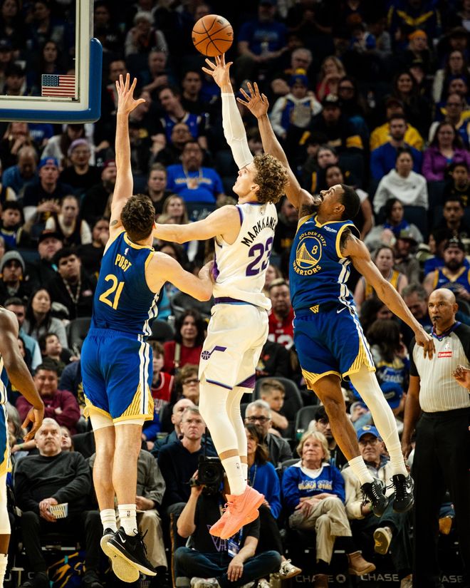 爵士队的马尔卡宁上半场得到21分,乔治得到15分和4次助攻;勇士队的库里得到9分,格林和穆迪各得到8分。
