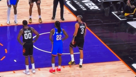 最后8.2秒,奥尼尔成功解决了世界性难题——边线发球。布克接球后,手握雷神之锤,面对雷霆俩个疯狗式防守的卡鲁索和多特,3分线外强行干拔,一剑封喉,绝杀雷霆。