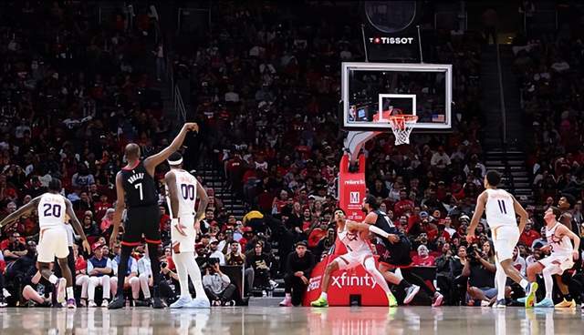 在申京因伤不能出战的情况下,火箭队的第一战术重心就放在了杜兰特身上,太阳队当然心知肚明,因此排出了狄龙对于杜兰特贴身防守,这一招不能说毫无效果,防守凶悍的狄龙,一上来就在给死神上强度,前两节虽然杜兰特也砍下了13分,但效率并不是非常高。但杜兰特的死神称谓也不是白给的,在本场比赛最后时刻,双方战成97-97平,布克先投出一个三不沾三分球,还剩下5.7秒,随后杜兰特命中超难度三分,只剩下1.1秒,随后,他向太阳球员招手示意,回家吧。算上这场比赛,火箭队本赛季完成了对太阳的三杀,杜兰特也算是出了一口恶气。