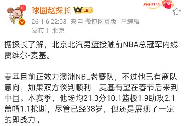 北京首钢在这样的前提下,开始接触麦基,由于NBL赛季结束的很早,所以麦基也有离队的想法,毕竟两份合同影响不大。