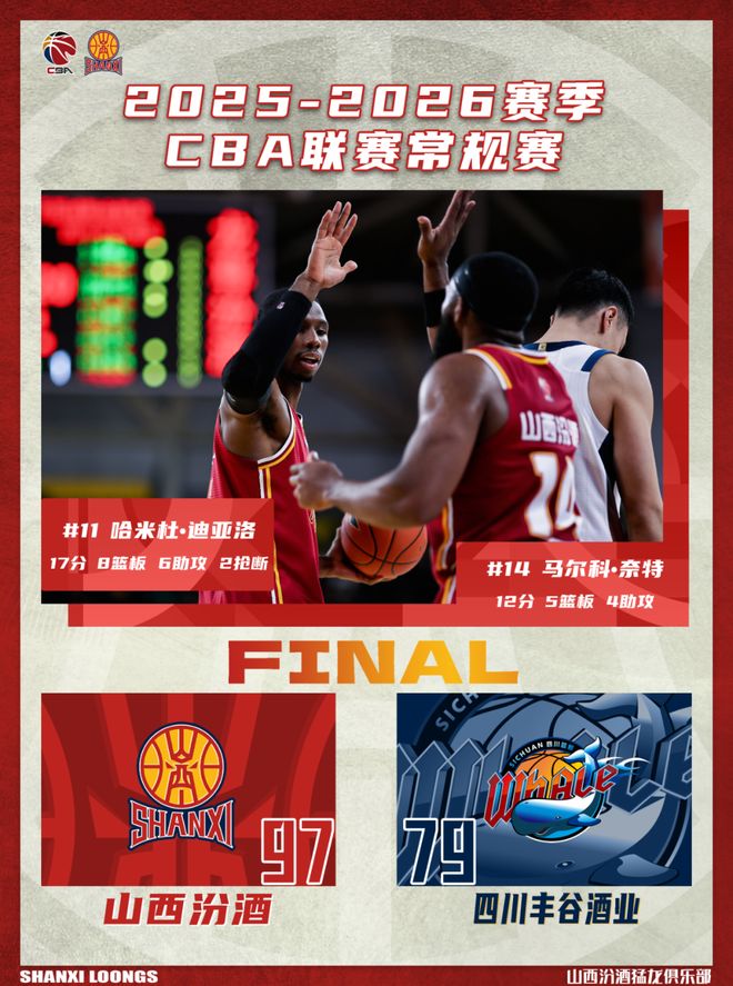 北京时间2026年1月6日19:35,2025-2026赛季CBA联赛第11轮继续进行,山西汾酒继续坐镇主场,迎战四川丰谷酒业。两队历史上共交手31次,山西汾酒18胜13负,上赛季常规赛两队交手4次,山西汾酒3胜1负。本场比赛,山西队整体发挥出色,拼抢篮板球积极,阶段性防守做的不错,尤其是对重点人的限制;但在进攻端依然存在处理球过于简单的问题,连续几场罚球命中率偏低,需努力提升改进,最终全场比赛结束,山西汾酒97:79战胜四川丰谷酒业。