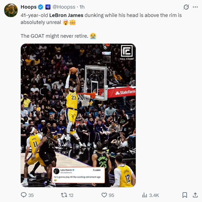 湖媒写道:41岁的詹姆斯还能再扣篮时头超高篮筐,这简直太不可思议了,GOAT或许永远不该退役。