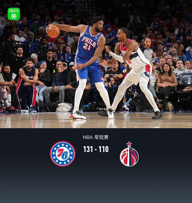 第四节76人格雷姆斯拿下14分,奇才卡林顿拿下6分,最终76人131-110战胜奇才