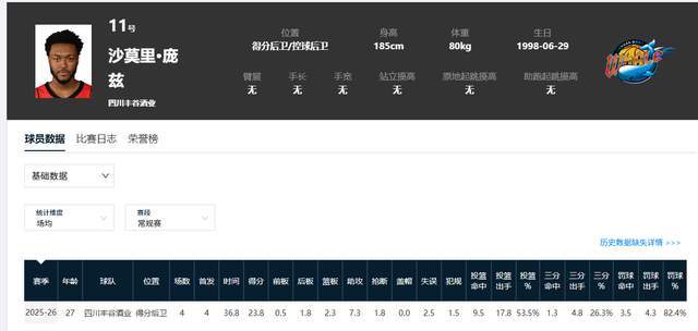 加盟四川男篮之后,庞兹带队打了4场,在场均36.8分钟时间里,能贡献23.8分2.3篮板7.3助攻1.8抢断,投篮命中率53.5%,三分球命中率26.3%,罚球命中率82.4%。
