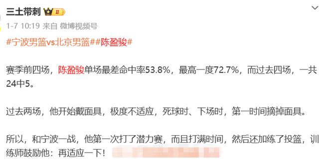 最近这段时间,陈盈骏一直饱受鼻骨骨折伤情的困扰,缺席了3轮比赛,1月3日打广厦才匆匆复出,为了防止比赛再次出现伤情,陈盈骏需要佩戴面具作战,一定程度上影响到他的投篮和传球视线,最近几场比赛,陈盈骏的投篮状态一直不佳,打广厦二番战,仅得5分,上一轮打宁波也仅4中1得到4分,并且还因为状态不佳主动参加了潜力赛加练。