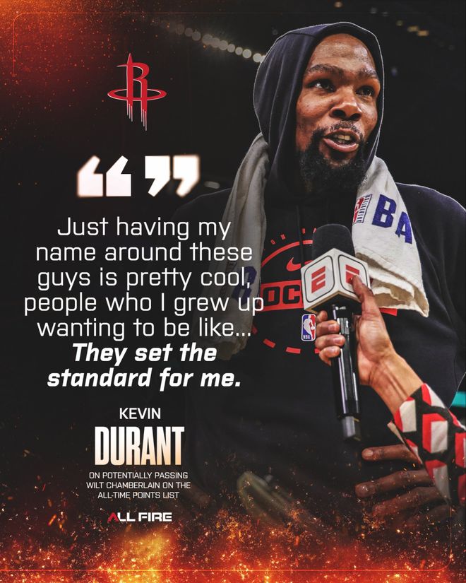 上个月,杜兰特成为联盟第八位生涯总得分突破31000分的球员,当时他坦言,能够与詹姆斯、贾巴尔、卡尔-马龙、科比、乔丹、诺维茨基和张伯伦这些名宿并肩,对他意义重大。