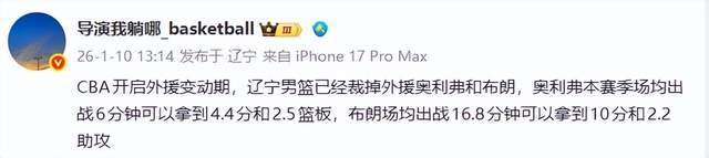 1月10日,CBA常规赛火热进行中,四冠王辽宁男篮战绩一般,和外援选择一般有很大的关系。如今,好消息终于来了,杨鸣不忍了!根据辽宁媒体人导演我躺哪的消息,辽宁男篮裁掉了两名外援——奥利弗和杰隆-布朗。而新援亨特有望对阵广东队的比赛时迎来首秀。