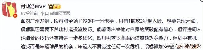 媒体人付政浩发文点评:面对广州龙狮,段睿骐全场11投0中一分未得,只有1助攻2犯规入账。想要兑现天赋,段睿骐还需要下苦功打磨投篮技巧。能看得出来他对自身的突破颇有信心,但行进间人球结合的技巧还有待进一步多样化。