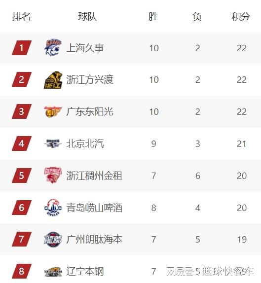 CBA积分榜最新排名出炉!:辽篮被广州挤到第8:广东第3新疆第17