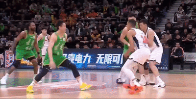 6分27秒,王岚嵚打进高难度折叠上篮2+1,但随后奎因再飚进2记三分,半节连拿9分,帮助广东扩大领先来到45-31!