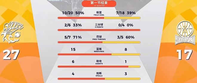 首节战罢,上海男篮27-17领先。
