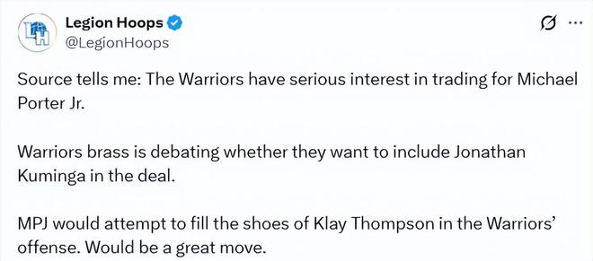 北京时间1月12日,美媒Legion Hoops报道称,金州勇士队对交易得到小迈克尔-波特抱有浓厚兴趣。勇士管理层正就是否将库明加纳入交易筹码展开讨论。小波特将力争填补克莱在勇士进攻体系中的空缺。这笔交易若是达成,将会是一步妙棋。