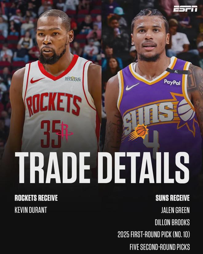 上赛季常规赛,火箭高居西部第2,如今变成西部第7。上赛季太阳仅排西部第11,连附加赛都没进,如今太阳已经升至西部第6。2025年休赛期,火箭送出杰伦-格林、狄龙、2025年首轮10号签和5个次轮签,8换1交易得到杜兰特。