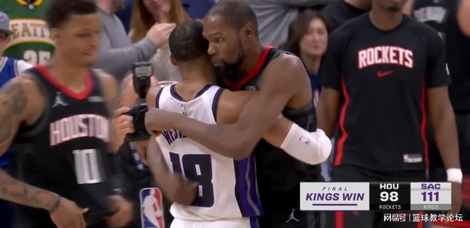 北京时间1月12日,NBA常规赛:西部垫底的国王主场111-98击败火箭。本赛季国王跟火箭交手3次,国王2胜1负。威少常规赛生涯一共跟杜兰特交手19次,威少12胜7负。赛后威少和杜兰特、亚当斯拥抱,大哥二哥分开已10年。
