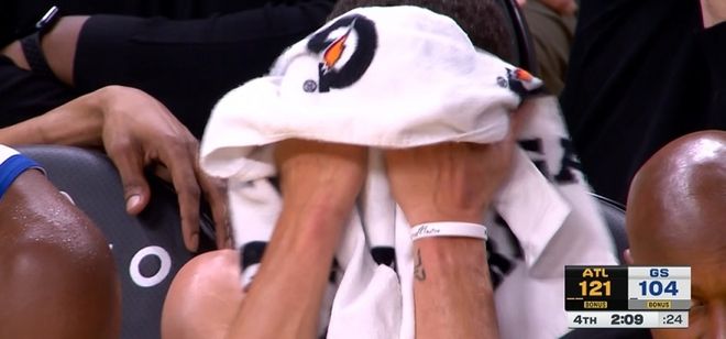 在第四节还剩下2分09秒的时候,库里被换下场之后,看到场上球队落后的情况,他坐在板凳上直接拿着毛巾捂脸,看到球队过大的比分差距,也是没眼看场上的情形。在第三节末段,老鹰队的肯纳德爆发连续轰进多记三分球,末节分差已经突破二十分,勇士再追分也无济于事,最终老鹰轻取勇士迎来三连胜。