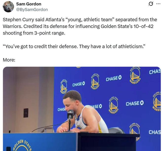 同时在老鹰队的防守下,勇士三分合计42投10中,命中率仅为23.8%,创造赛季新低,赛后库里直言:“必须称赞他们的防守,他们运动能力超强。”