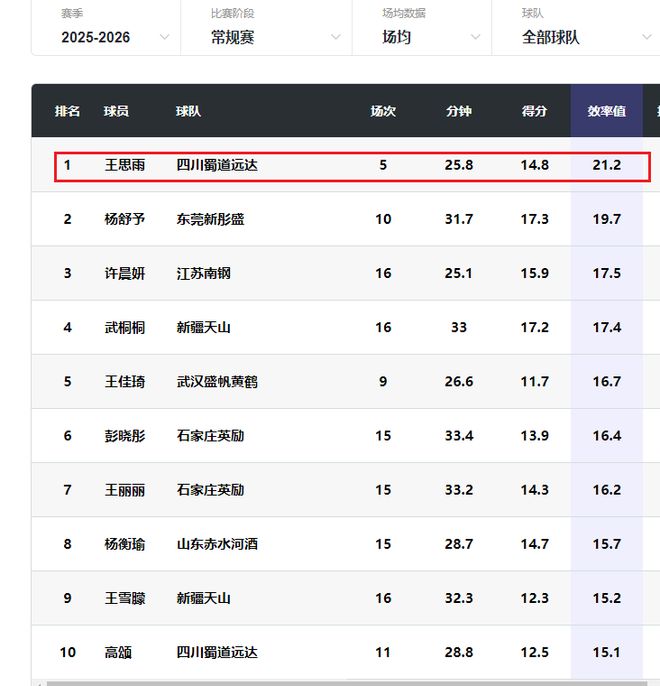 王思雨本赛季的效率值达到了21.2,力压杨舒予、许晨妍、武桐桐排名本土球员第一。30岁的王思雨依然很能打,值得在国家队获得重用。王思雨完全可以打到洛杉矶奥运会。中国女篮现在有意进行换血,但是年龄不该是评判是否入选国家队的标准。王思雨的效率值位居本赛季WCBA本土球员第一,她理应再次进入国家队,并且获得重用。