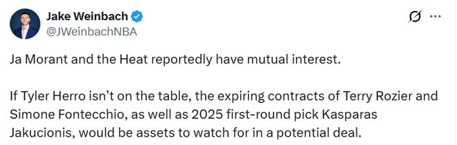 北京时间1月14日,据NBA记者Jake Weinbach报道,据报道,贾-莫兰特与迈阿密热火队双方互有兴趣。若泰勒-希罗不被纳入交易讨论范围,那么罗齐尔和丰泰基奥的到期合同,以及2025年首轮秀亚库西奥尼斯,将成为这笔潜在交易中值得关注的筹码。