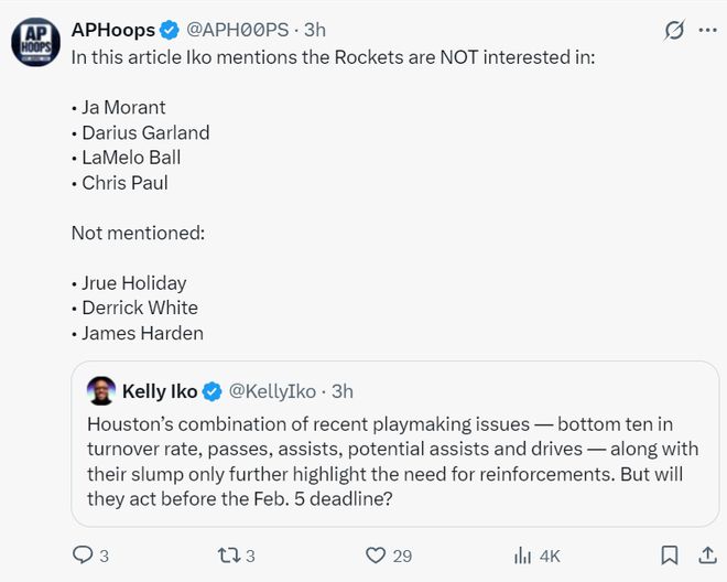 北京时间1月17日,凯利-伊科的推文披露了火箭队在交易截止日可能的动向,他表示火箭队已经收到关于伊森、卡佩拉、芬尼-史密斯等多人的询价,火箭队不会为了补强一号位而仓促的做决定,但火箭队对莫兰特、加兰、拉梅洛、保罗这些控卫不感兴趣,但文中没有说对哈登、朱-霍勒迪、德里克-怀特不感兴趣,也就是说有可能对这三人感兴趣。