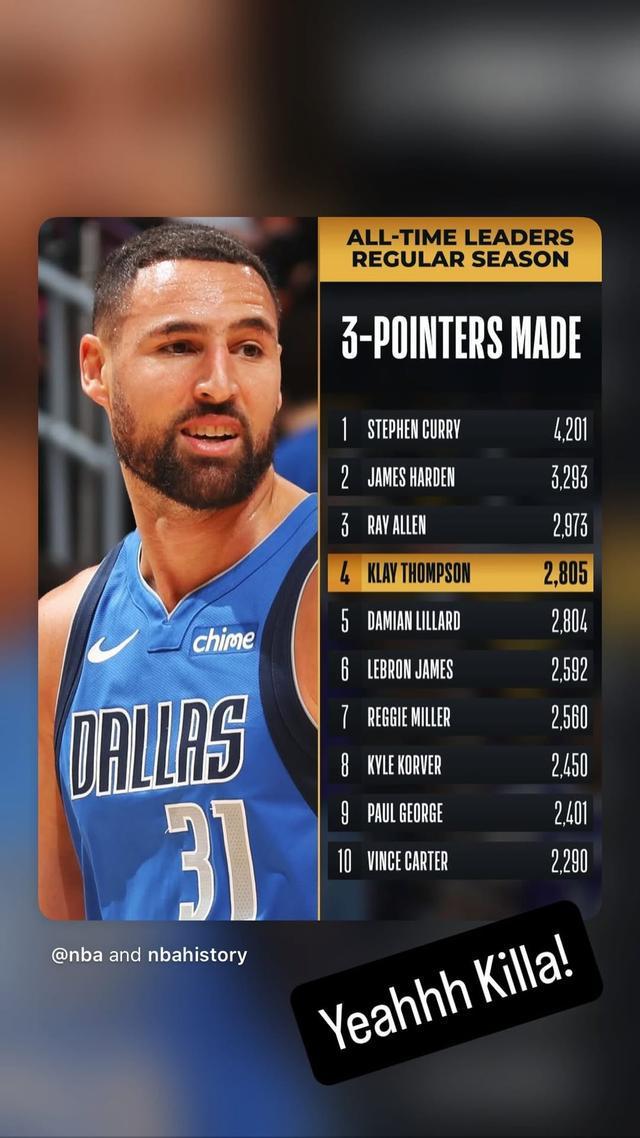 在达拉斯独行侠队主场对阵犹他爵士队的比赛中,克莱-汤普森首节投中一记三分,让自己的职业生涯三分球命中数超越利拉德,升至NBA历史第四位。