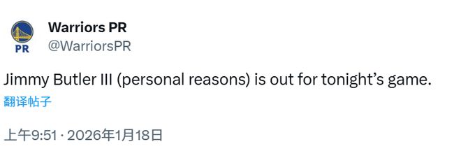 临场退赛,勇士官方:巴特勒因个人原因缺席今天的比赛