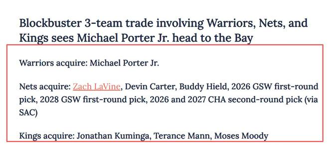 联盟内部对这笔交易的共识是,多方框架是实现共赢的唯一路径。由于勇士对小波特的兴趣明确,而篮网渴望积累更多重建资产,库明加成为了关键的“桥梁型筹码”。这位23岁锋线在1月15日交易限制解除后,其合同价值被重新激活——2026-27赛季2430万美元的球队选项,既具备薪资匹配的灵活性,又能为第三方球队提供后续操作空间,被管理层视为“复杂交易中的优质资产”。最终浮出水面的潜在方案的核心的是:勇士引进小迈克尔·波特;篮网收获扎克·拉文、德文·卡特、巴迪·希尔德,以及勇士2026年、2028年首轮签和通过国王获得的2026、2027年黄蜂次轮签;国王则得到乔纳森·库明加、特伦斯·曼与摩西·穆迪。