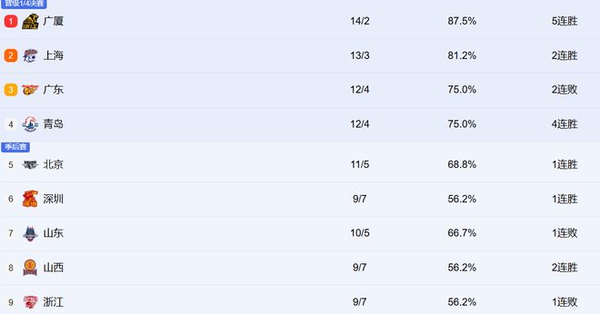 辽宁、宁波排在10和11。现在辽宁的情况非常糟糕,外援和本土球员的水平都不行,他们只能尽可能巩固季后赛的席位。宁波也是8胜8负,但他们已经两连败了,他们欠缺锋线,后续的赛程还比较艰难,看看能不能顶住吧。