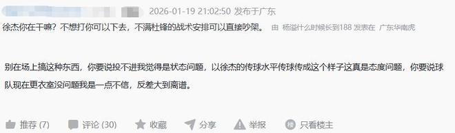 赛后,不少广东球迷对于徐杰也发表了不同看法,支持徐杰的球迷继续为他加油鼓劲,并且还有一些球迷指出了徐杰好像身体又出现了不适症状,第二节最后阶段左脚踝疑似出现了伤情(这应该是徐杰下半场打的差原因之一);