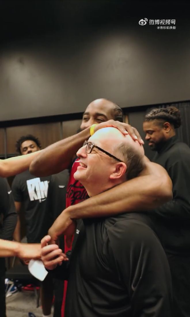 年轻队员带头唱起了生日歌,而哈登给范大爷来了个摸头杀,范甘迪似乎不在意。