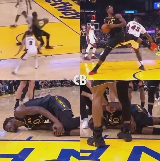 近日结束的勇士主场135-112大胜热火比赛,进行到第三节时候,巴特勒接波杰姆斯基传球,在对抗中轰然倒下。