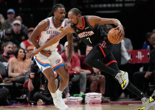 今天主教练乌度卡延续了首战战略思路,不过没有把亚当斯摆上首发。而是上奥科吉去应对五大速度不足的缺陷。火箭希望用体型和篮板优势拖慢雷霆节奏,逼迫对手打阵地战,减少快攻和转换得分的机会。火箭首发调整为奥科吉和阿门搭档后场,史密斯出任小前锋,锋线搭配杜兰特,内线则由申京坐镇。从数据上看,火箭的篮板策略确实奏效。全场火箭狂抢60个篮板(其中23个前场篮板),大幅领先雷霆的44个篮板(前场仅7个),足足多出15次二次进攻机会。