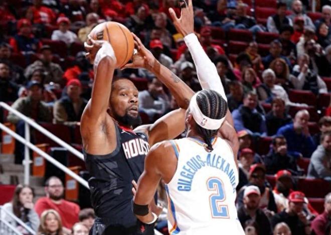 火箭这边杜兰特则更加挣扎,全场23投7中,三分5投0中,得到19分7篮板3助攻3抢断,进攻效率明显被雷霆锋线群掐死。既然核心都被限制住,比赛胜负就落在了角色球员的发挥和球队整体深度上。前三节双方你来我往,始终处于胶着状态。首节雷霆仅领先2分(21-19),第二节申京和杜兰特逐渐找到手感,火箭一度将比分追平。但只要火箭稍稍放松对亚历山大的盯防,他立刻能利用突破和罚球连续得分,半场雷霆重新拉开到7分。下半场火箭短暂起势,戴维森雨姐命中三分和中投,一度将分差追至仅剩2分,看起来有翻盘希望。