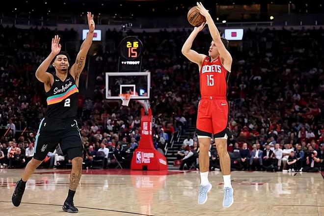 本场比赛中,之前一段时间的表现都有些不温不火的火箭后场新星里德-谢泼德(Reed Sheppard)的表现令人刮目相看。谢泼德全场出场29分10秒,投篮17中8,三分线外10中4,罚球2中1,得到了全队最高分21分外加2篮板4助攻1抢断1盖帽的数据,正负值更是达到了全场最高的+15。值得一提的是,谢泼德在比赛第四节单节拿下了12分,而马刺全队在比赛最后一节只得到了14分。火箭能够在一度局面不利的情况下在第四节扭转局面,也和谢泼德的强势表现密切相关。谢泼德在进攻端终于发挥出了自己的投射能力,他也是命中了多记外线投篮,而且他也是具备一定的突破能力的。谢泼德也是展现出了一定的传球能力和组织能力,在防守端也没有出现什么太大的问题。至少在本场比赛中,谢泼德算是起到了一锤定音的作用,要不是由他在最后一节的大爆发,火箭估计都很难取得胜利。