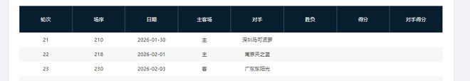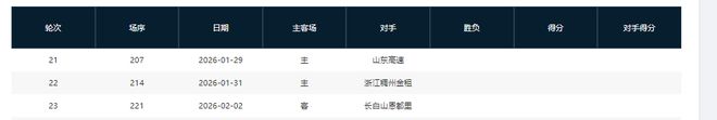 分别是客战吉林(暂居第13)、主场战山西(暂居第8)、主场战天津(暂居第16)、主场战吉林(暂居第13)、客场战宁波(暂居第11)、主场战上海(暂居第2)
