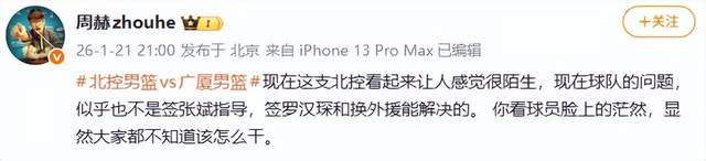 另一位北京媒体人周赫老师则表示,“现在这支北控看起来让人感觉很陌生,现在球队的问题,似乎也不是签张斌指导,签罗汉琛和换外援能解决的。 你看球员脸上的茫然,显然大家都不知道该怎么干。