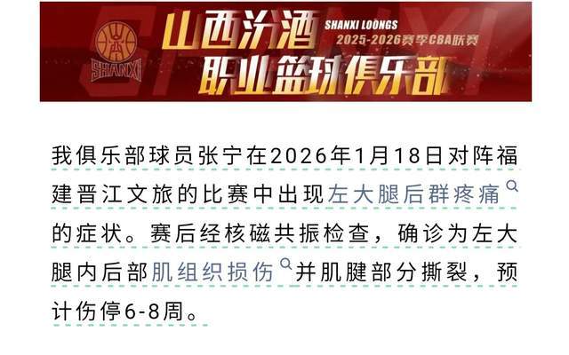 更令人悲伤的是,在与福建队的比赛中,张宁受伤了。根据山西男篮自己官宣的消息,张宁被确诊为左大腿内后部肌组织损伤并肌腱部分撕裂,预计伤停6-8周。如此一来,张宁将会无缘新一期中国男篮集训队了,让郭士强失去一大选择,真是太遗憾了。