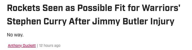 《CBS Sports》的Sam Quinn就支招火箭队趁乱交易库里,他认为巴特勒赛季报销后,勇士队已经无法帮助库里竞争冠军,如果库里仍希望赢得冠军,那么加盟休城携手老队友杜兰特将是绝佳的选择。