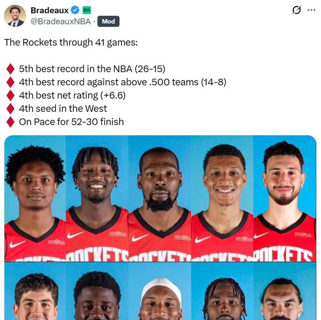 好在开局表现强势,加上1月中旬势头随着小贾找回三分手感,以及谢泼德的爆发战绩有所回暖,才让火箭队在半程之际重返西部第四位置。