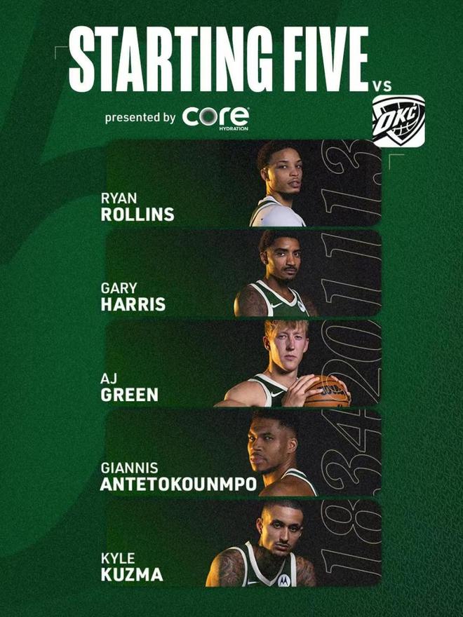 雄鹿:哈里斯、罗林斯、字母哥、库兹马、格林